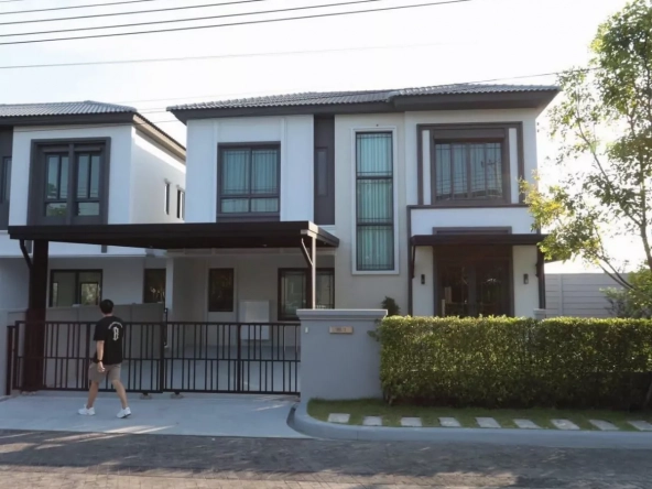 This brand-new luxury detached house is located in a newly developed project in the Bangna area. The house is situated on the main road of the village, providing a comfortable, non-congested living environment. It is in the first phase of the project, close to the park, fitness center, and a large swimming pool. The area is surrounded by nature, ideal for relaxation, and perfect for children to play freely.