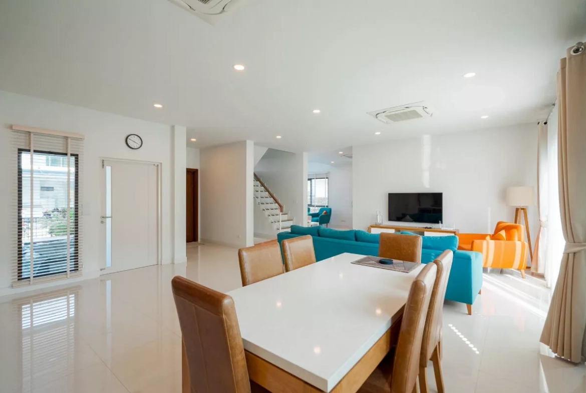 Located in the prestigious The City Rama 9 – Krungthep Kreetha development on Srinakarin–Rom Klao Road in Saphan Sung district, this fully furnished modern home offers an ideal living space for large families.