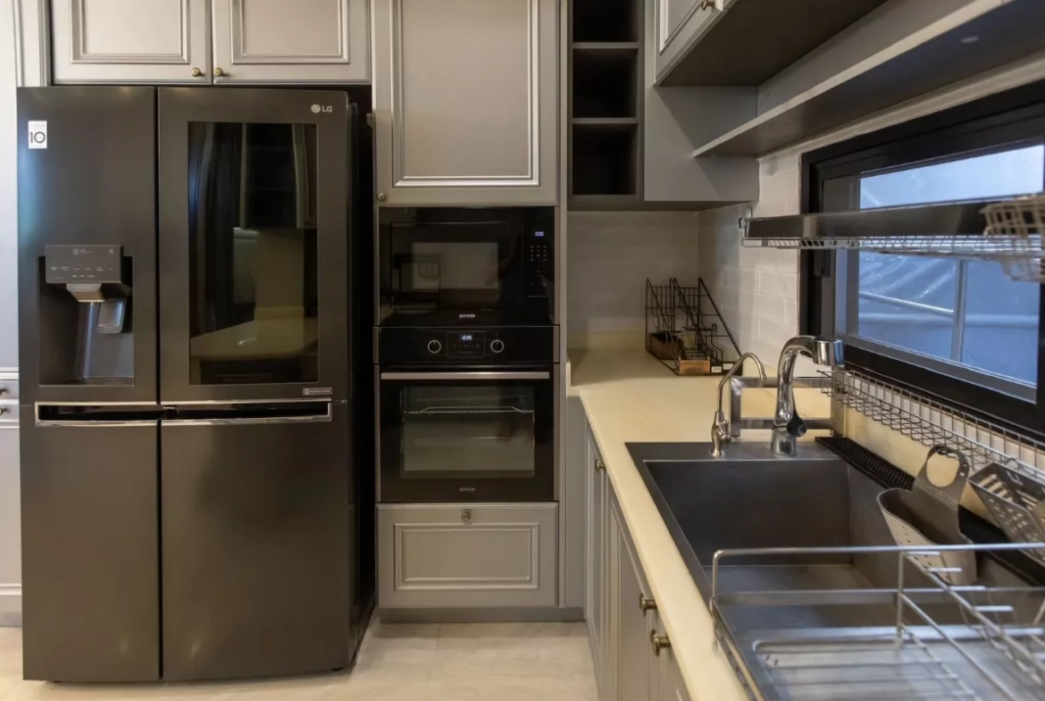 (3 TVs, refrigerator, electric stove, oven, microwave)