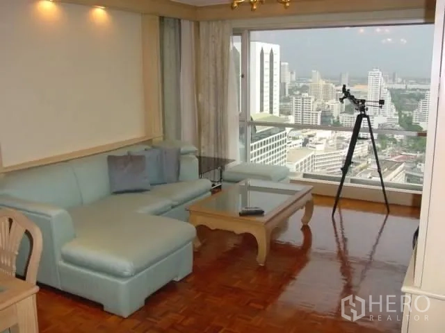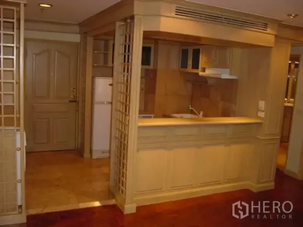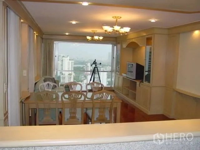 Discover a bright 80 sqm, 1-bedroom, 1-bathroom condominium in Watthana, just moments from BTS Nana. The open-plan living and dining area features floor-to-ceiling windows, warm wood flooring, and a private balcony with skyline views. A modern kitchen comes fitted with ample cabinetry, stovetop, range hood, and a full-size fridge. The serene bedroom includes a built-in wardrobe, while the bathroom offers a glass-enclosed shower and quality fixtures.