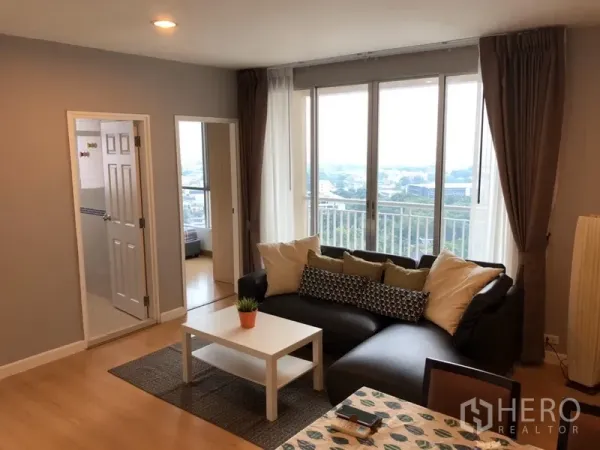 Move into a 43 sqm, 1-bedroom, 1-bath condominium in Watthana, ideal for city living near BTS Phra Khanong. The bright lounge pairs a beige L-shaped sofa with a compact dining corner and a stylish striped feature wall. A restful bedroom offers a sliding wardrobe and window blinds, while the bathroom includes a relaxing bathtub. The separate kitchen opens to the balcony and comes fitted with orange cabinetry, sink, cooktop, hood, and fridge—perfect for everyday cooking.