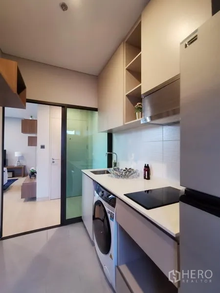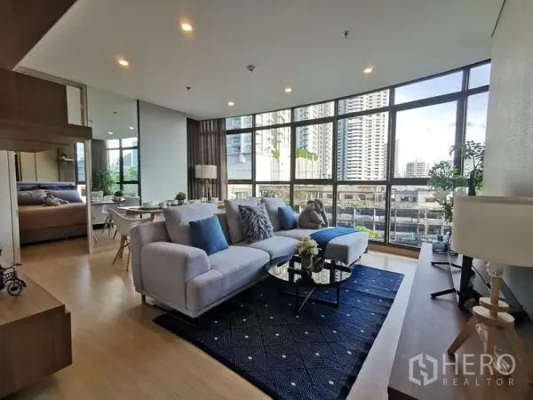 Discover a 61 sqm, 2-bedroom, 2-bath condominium in Ratchathewi, Bangkok, set near BTS Nana for effortless city commuting. The open-plan living and dining area enjoys floor-to-ceiling windows and city views, while a sleek fitted kitchen with hob and hood makes everyday cooking easy. The master suite includes an ensuite and built-in wardrobe; the second bedroom is served by a stylish bathroom with a glass shower. Facilities include a swimming pool, fitness center, secure parking, keycard access, and 24-hour security.