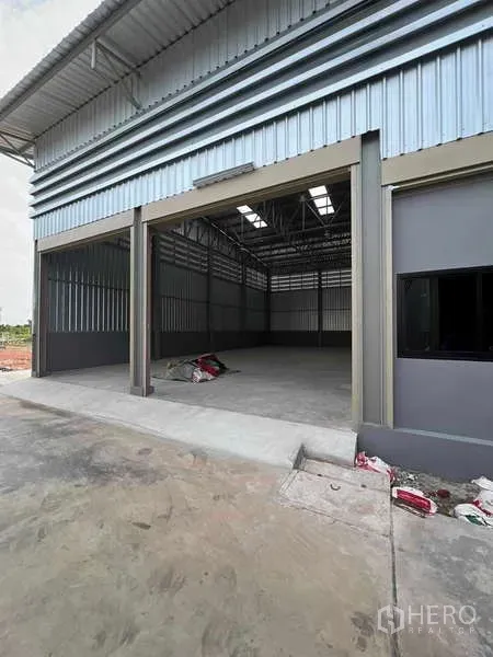 Industrial warehouse for sale in Phra Samut Chedi, Samut Prakan, offering approximately 1,800 sqm of usable space. The building features a high-clear span gable roof with ample skylights, excellent ventilation, and a durable concrete floor suitable for storage, light production, or logistics. A central drive-through lane, multiple shutter access points, and an internal glass-partition office enhance daily operations. The broad front yard allows easy truck maneuvering and on-site parking.