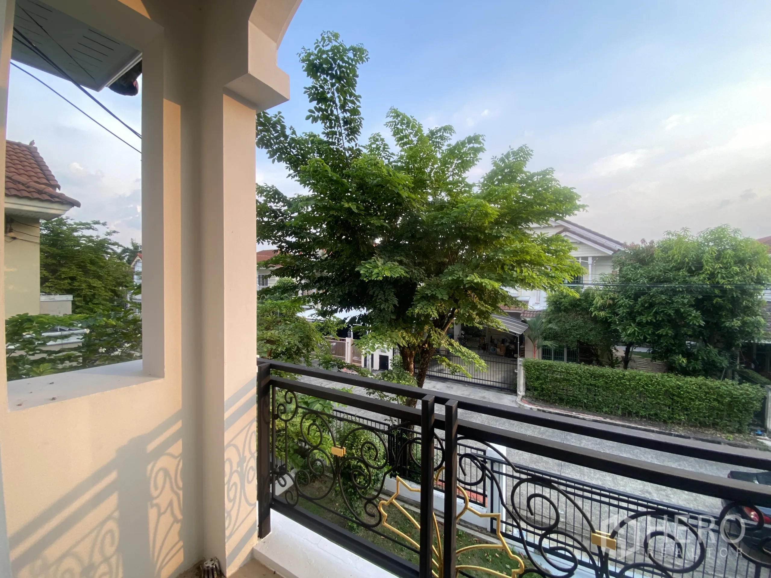 This refurbished two-storey detached house in Bang Rak Noi, Mueang Nonthaburi offers 160 sqm of airy living space on 50 sq wah of land (about 200 sqm, ~0.125 rai). The open-plan ground floor connects living and dining through wide sliding doors to a green lawn, while a practical pantry with sink simplifies meal prep. Two bathrooms feature walk-in showers and neutral tiles. Upstairs, two bright bedrooms boast warm wood floors; the spacious master opens to a balcony with leafy neighborhood views. A covered carport and side garden complete the home.