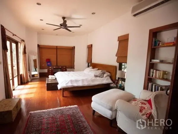 For rent in Khlong Tan Nuea, Watthana, this detached house offers 350 sqm of usable space on 40 sq wah of land (approx. 160 sqm; ~0.10 rai). The multi-level home features a gated carport, bright open-plan living and dining area with floor-to-ceiling windows, and a modern L-shaped kitchen with gas hob, oven and ample storage. A second family lounge with parquet floors adds flexible space, while the four bedrooms and four bathrooms include a light-filled master that opens to a private balcony.