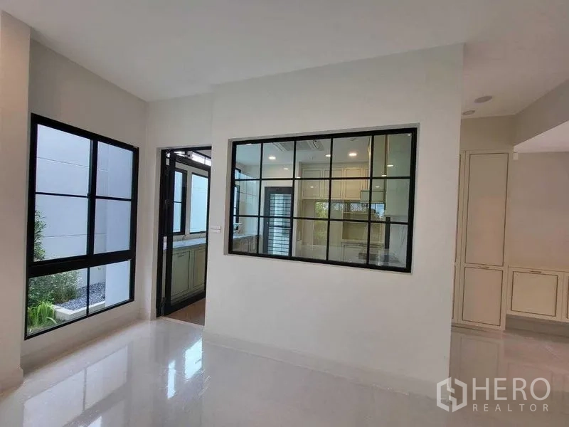 This modern detached house in Bangkok offers 302 sqm of bright, functional living on a 103 sq wah plot (approx. 412 sqm or 0.26 rai). A generous open-plan lounge features high ceilings, recessed lighting and floor-to-ceiling sliding doors connecting to the landscaped garden. The upper floor showcases elegant herringbone wood floors, a versatile landing and a serene master suite with a spa-style bathroom boasting a freestanding tub and glass shower. A closed gourmet kitchen presents marble counters and backsplash, built-in oven, large fridge and a walk-in pantry, while a fitted dressing room adds extra storage. In total there are 4 bedrooms and 5 stylish bathrooms.