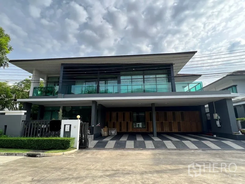 Live large in this modern detached house in Bang Kapi, Bangkok. Offering 399 sqm of usable space on a 102 sq wah plot (~408 sqm, ~0.26 rai), the 5-bedroom, 5-bath layout suits multigenerational living. Interiors are bright and welcoming with floor-to-ceiling windows, wood floors and multiple lounges. Cook and gather in the open-plan kitchen and dining area, then relax in the airy living room or the upstairs family room. The master suite opens to a balcony, while generous storage and built-ins keep everything organized. Outside, a landscaped side garden with low‑maintenance turf complements the wide covered carport and storage wall.