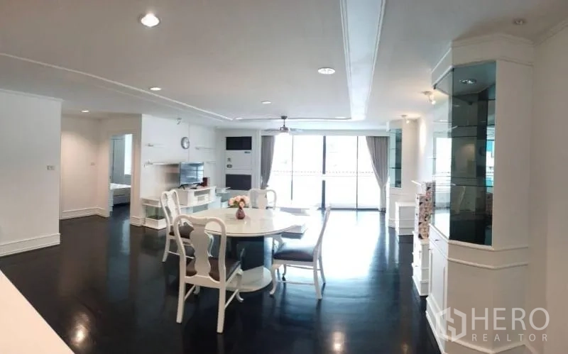 Enjoy 160 sqm of living space in this 2-bedroom, 2-bath condominium in Sathon, just a short walk from BTS Surasak. The bright U-shaped kitchen features granite countertops, ample cabinets, an electric cooktop with hood, double sink, and a dedicated laundry corner with washing machine plus balcony access. The open living and dining area offers floor-to-ceiling sliding doors, a ceiling fan and built-in storage, extending to a private balcony with neighborhood views.