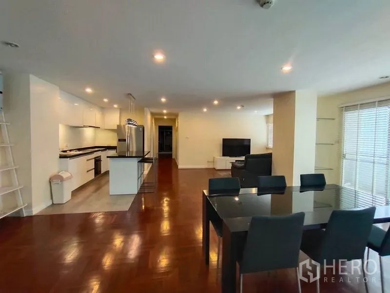 Live in the heart of Silom with this spacious 144 sqm, 2‑bedroom, 2‑bath condominium. The home features an airy open‑plan living and dining area, a sleek peninsula kitchen with black stone countertops, pendant lighting, and stainless‑steel refrigerator. Both bedrooms are generously sized with wood floors and built‑in storage, while the bathrooms offer stylish glass‑enclosed showers. A separate laundry/utility room adds everyday convenience.