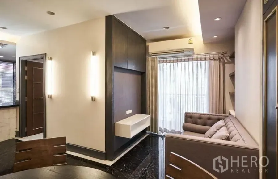 Set in the heart of Ratchathewi, this 60 sqm 1-bedroom, 2-bathroom condominium for sale blends warm contemporary design with practical city living. The open-plan lounge features glossy black marble floors, custom cabinetry and soft cove lighting. A designer kitchen anchors the home with black stone countertops, premium built‑in oven and microwave, generous storage and a sleek breakfast bar. The serene bedroom has an upholstered feature wall and fitted wardrobe, while both bathrooms showcase hotel‑style stone tiling, glass showers and elegant fixtures.