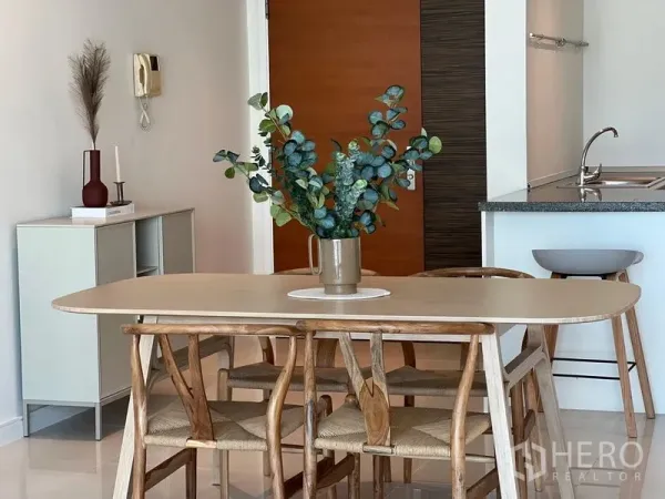 Step into a bright 96 sqm, 2-bedroom, 2-bath condominium in Watthana, moments from BTS Ekkamai. The airy living and dining area features floor-to-ceiling windows and wood floors, opening to a balcony with Sukhumvit skyline views. A modern open-plan kitchen comes with built-in appliances and ample storage. The primary bedroom includes fitted wardrobes and an en-suite bathroom, while the second bedroom suits guests or a home office. Residents enjoy a swimming pool, fitness center, secure lobby, parking, and 24-hour security.