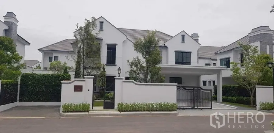 Contemporary detached house for sale in Saphan Sung, Bangkok, offering 302 sq m of refined living. The 4-bedroom, 6-bath layout features a sunlit lounge wrapped in full-height windows, an elegant dining area beneath a crystal chandelier, and serene bedrooms with quality flooring and cassette air-conditioning. A spa-style bathroom presents marble finishes, a glass shower and a freestanding tub. Outside, the landscaped garden and lush side lawn provide room for relaxation and play.