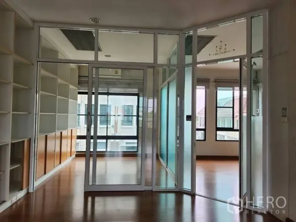 Designed for live–work flexibility, this 3-bedroom, 3-bath home office offers 400 sq m of usable space on 100 sq wah of land (approx. 400 sq m, ~0.25 rai) in Lat Phrao. Sunlit rooms showcase rich hardwood floors, recessed ceilings and black-framed picture windows. A glass-front studio opens to landscaped courtyards, while a cozy balcony enjoys leafy views for relaxing breaks or creative meetings.