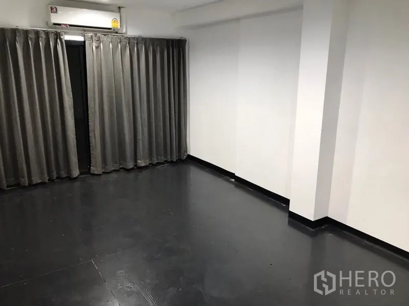 Position your business steps from BTS Phrom Phong in this flexible 150 sq m home office in Khlong Toei. The layout offers deep open-plan rooms with black floors, white walls and recessed lighting, sliding glass doors to small balconies, built-in shelving and mirrored cabinetry, plus multiple air-conditioned rooms suited for meeting rooms, studio or private offices. A corridor with several doors supports staff facilities and storage. The land area is 27 sq wah (approx. 108 sq m or 0.07 rai), giving generous frontage and utility for signage or reception.