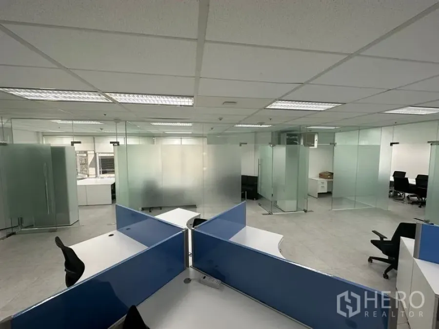Set to move in, this 188 sqm office for rent in Pathum Wan places your team minutes from BTS Phloen Chit. The glass-partitioned layout includes a welcoming reception, open-plan workstations, executive rooms and a bright boardroom with projector screen and skyline views. Large windows bring natural light, while tiled floors, drop ceilings and roller blinds ensure everyday comfort. A compact server/storage room, pantry and built-in cabinetry add daily practicality.