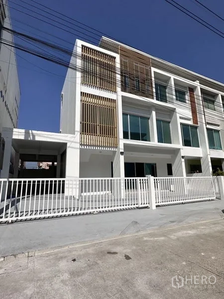 This modern multi-level home office for rent in Bangkok offers approximately 400 sqm of usable space across bright open-plan floors. The ground level presents a wide frontage with sliding glass doors, a sheltered terrace, and secure gated parking/loading. Interiors feature glossy tile corridors, glass-partitioned rooms ready for meetings or private offices, a sleek wooden staircase, and 4 well-kept bathrooms including a shower. Ideal for a showroom, creative studio, clinic, or SME headquarters.