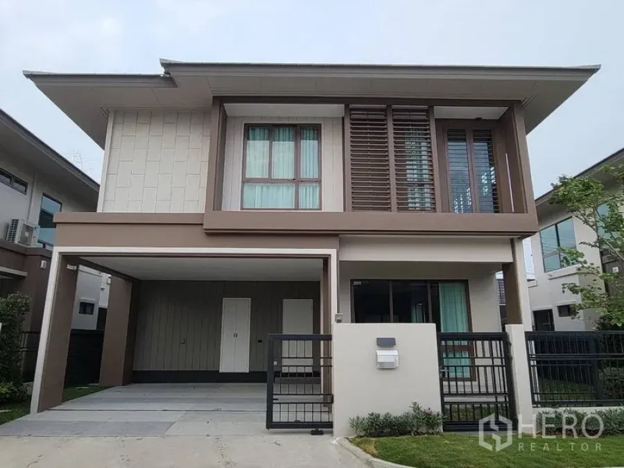 Set in Hua Mak, Bang Kapi, this modern detached home offers 196 sqm of usable space across two light-filled levels. The ground floor features a bright open-plan living and dining area framed by floor-to-ceiling windows and sliding doors to the private garden. A practical separate kitchen comes with stone countertops, cooktop and hood, sink window, and space for laundry. Upstairs are four well-proportioned bedrooms with wood floors and air conditioning, paired with four bathrooms for everyday convenience. A gated entrance and covered parking for two cars complete the home.