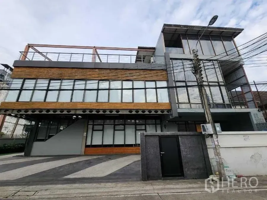 This loft-style home office in Mueang Nonthaburi offers 700 sqm of flexible space across double-height halls, open-plan work zones and meeting rooms. Set on 150 sq wah (approx. 600 sq m, 0.38 rai), the property features a striking glass-and-steel façade, mezzanine walkways, a large studio floor, covered terrace and 9 bathrooms—ideal for a headquarters, creative studio, training center or showroom.