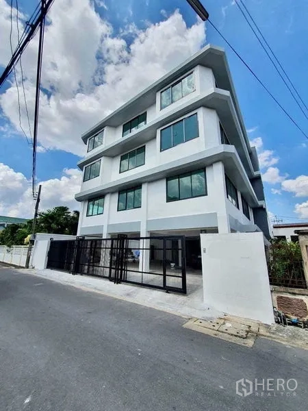 Presenting 2,500 sqm of adaptable office space in Ram Inthra, Khan Na Yao. The building delivers bright, open‑plan floors with large black‑framed windows, polished tile flooring and robust columns for flexible layouts. Sliding doors open to wide balconies and a generous rooftop terrace with skyline views. Private rooms and modern restrooms are in place, while lower levels with durable concrete floors suit storage or back‑of‑house operations. Set on 100 sq wah of land (approx. 400 sqm or 0.25 rai), the secure, gated compound provides visibility and easy loading.