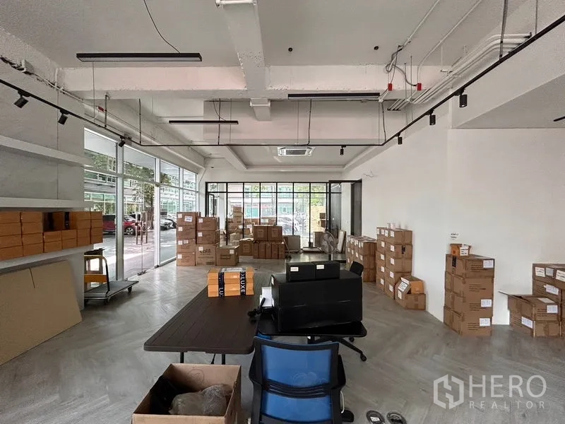 Set in Ekkamai, Phra Khanong, Khlong Toei, this 300 sqm standalone office features striking floor‑to‑ceiling glazing, sun‑shade louvers and leafy views for abundant natural light. The ground level offers a flexible open plan layout ideal for reception, collaboration or showroom use. Upstairs, find private rooms and a meeting room, supported by a well‑equipped pantry, modern air‑conditioning, recessed and track lighting, and practical flooring ready for your workspace configuration.
