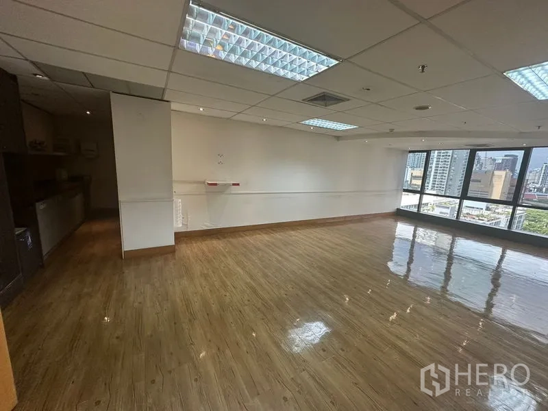 Set your business up in this 550 sqm office for rent on a high floor of a Sukhumvit tower in Khlong Toei, minutes from BTS Ekkamai. The floor plate combines a large open-plan workspace with executive rooms overlooking the skyline, a striking reception/lounge with designer carpets, a pantry, and a separate storage room. Full-height windows bring natural light across the space, while raised floor boxes, built‑in cabinetry and suspended ceilings with recessed lighting support efficient layouts for teams, meeting zones and training areas.