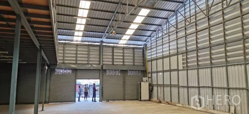 Positioned just off Ratchadaphisek near MRT Sutthisan, this warehouse for rent in Huai Khwang delivers 459 sqm of efficient space on a 120 sq.wah land plot (approx. 480 sqm ≈ 0.3 rai). The steel-frame building features a covered loading apron, multiple roller shutters and a gated frontage for smooth truck movements. Inside, a high-clearance hall with skylight roof panels and ventilation louvers provides bright, airy conditions. A mezzanine adds flexible storage or light assembly capacity, complemented by a simple restroom and a front glass-door entry suited for office setup.