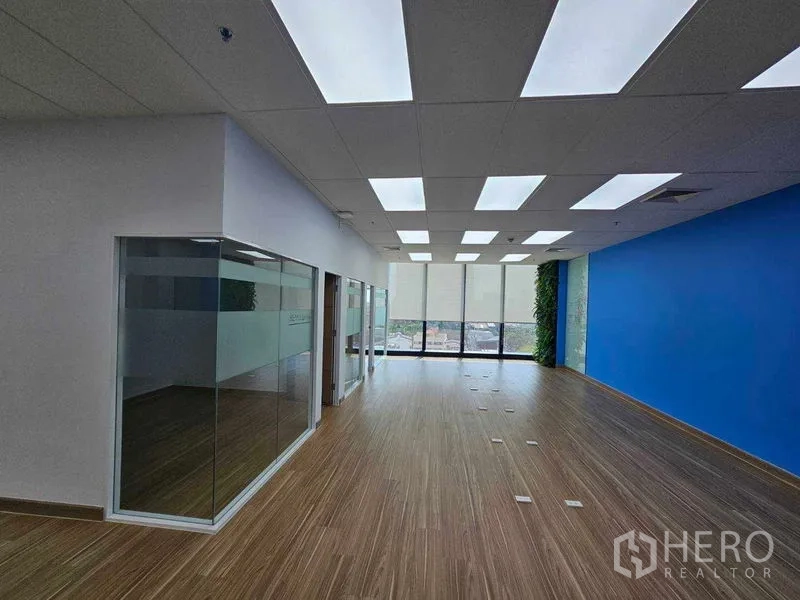 Secure a professional base in Sathon with this 148 sqm office for rent near BTS Chong Nonsi. The bright open-plan layout features wood-look flooring, LED panel lighting and centralized air-conditioning. Floor boxes are ready for data and power, while floor-to-ceiling windows deliver city views with roller blinds for glare control. Three glass-partitioned rooms suit meetings or executive offices, complemented by a fitted pantry and a compact storage/server room.