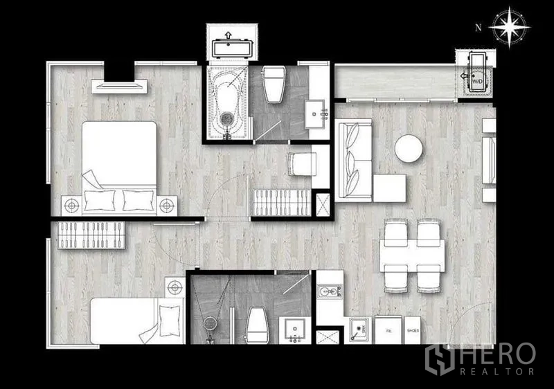 Move into a bright 2-bedroom, 2-bathroom condominium with 58 sqm of usable space in the heart of Watthana. The layout offers a comfortable living area that opens to a balcony, a practical kitchenette, and well-sized bedrooms with built-in storage. Modern finishes, air-conditioning, and secure key-card access make this home ideal for professionals or small families. Building facilities typically include a swimming pool, fitness center, 24-hour security, and parking.