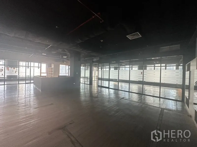 This 535 sqm office in Bang Rak’s CBD delivers a flexible open-plan layout with multiple glass-partitioned rooms for meetings and private offices. Natural light pours in through large windows, highlighting wood-look floors, a reception island, built-in shelving, and colorful staff lockers. The industrial-style exposed ceiling, ample power points, and a bright pantry make day-to-day operations efficient and comfortable.