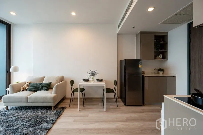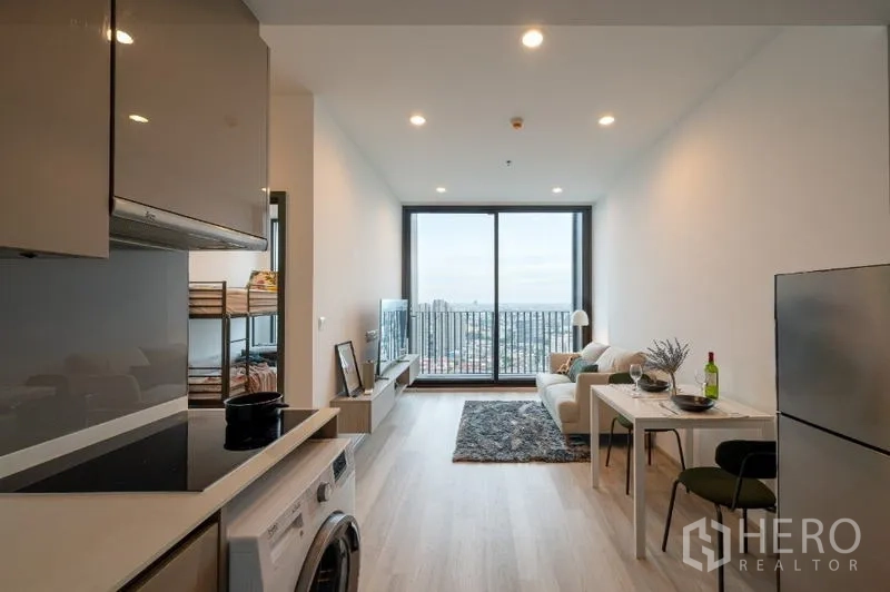 Step into a bright 2-bedroom, 2-bath condominium offering 53 sqm of efficient space in Phra Khanong. The airy living area features floor-to-ceiling windows and opens to a private balcony with urban views. A modern open-plan kitchen with hob and ample cabinetry pairs perfectly with a cozy dining nook. Both bedrooms are well-proportioned with built-in storage, while two sleek bathrooms include glass-enclosed showers for everyday comfort. Just a short walk to BTS Punnawithi, this home makes commuting along Sukhumvit effortless.