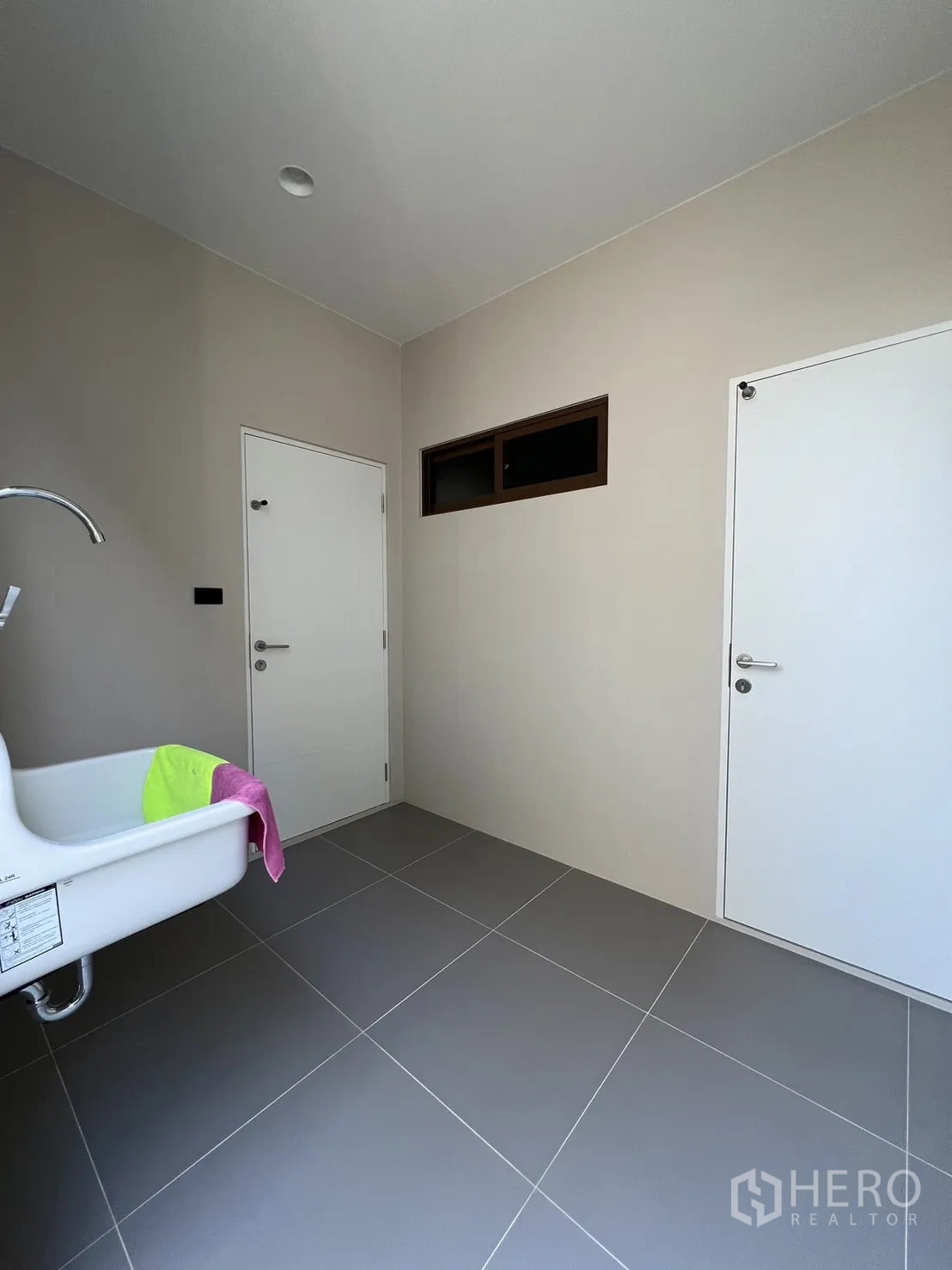 Modern luxury detached house for rent in Bang Kapi, Bangkok at Burasiri Krungthep Kreetha. Generous 300 sq.m. usable area on 80 sq.wah of land (approx. 320 sq.m. or 0.20 rai). The home is fully furnished with 4 bedrooms, 5 bathrooms, a maid’s room and parking for 3 cars. Light-filled living areas open to a landscaped courtyard garden, a show kitchen with marble island pairs with a separate Thai kitchen, and the master suite features a walk-in closet and spa-like bathroom. An upstairs family lounge adds flexible living space.