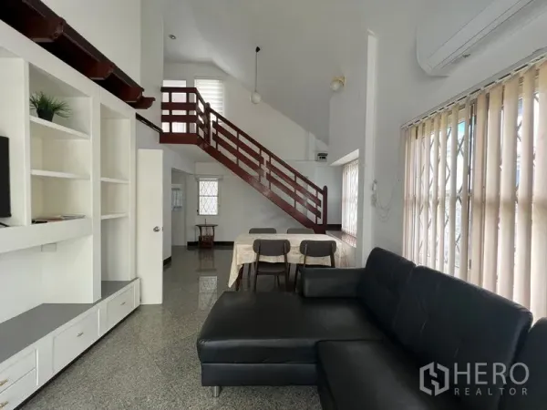 Enjoy modern family living in this 4-bed, 5-bath detached home for rent at Vive Krungthep Kreetha in Saphan Sung. The residence offers 420 sqm of usable space on an 86 sq wah (~344 sqm, ~0.21 rai) land plot. Bright open-plan living flows to a dining area and designer kitchen, plus a separate pantry/Thai kitchen. All bedrooms are generously sized with ensuite bathrooms; the master features a walk-in area and vanity. Multiple lounges, a work corner and a covered terrace overlook a private side garden, perfect for relaxing or entertaining.