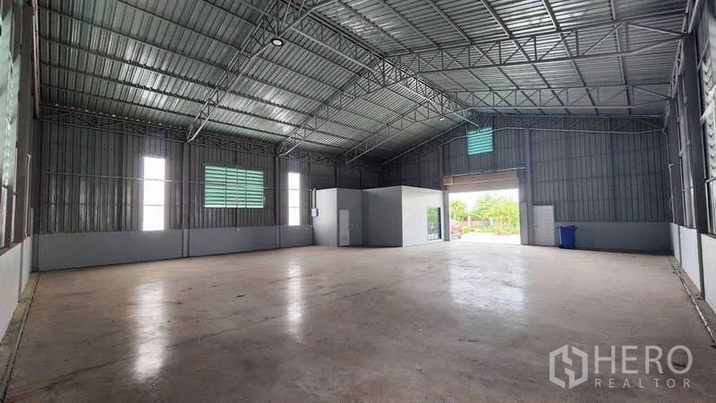 Secure a versatile warehouse for rent in the Lam Pho area of Bang Bua Thong, Nonthaburi. Offering 270 sqm of usable space on 100 sq wah of land (approximately 400 sqm, around 0.25 rai), this property features a wide roller shutter, high ceilings, bright open-plan floor, and good ventilation. A covered loading bay supports efficient deliveries, while truck-friendly access, a secure gate, and on-site parking enhance daily operations. An office mezzanine and a clean staff restroom add convenience for storage, distribution, or light industrial use.