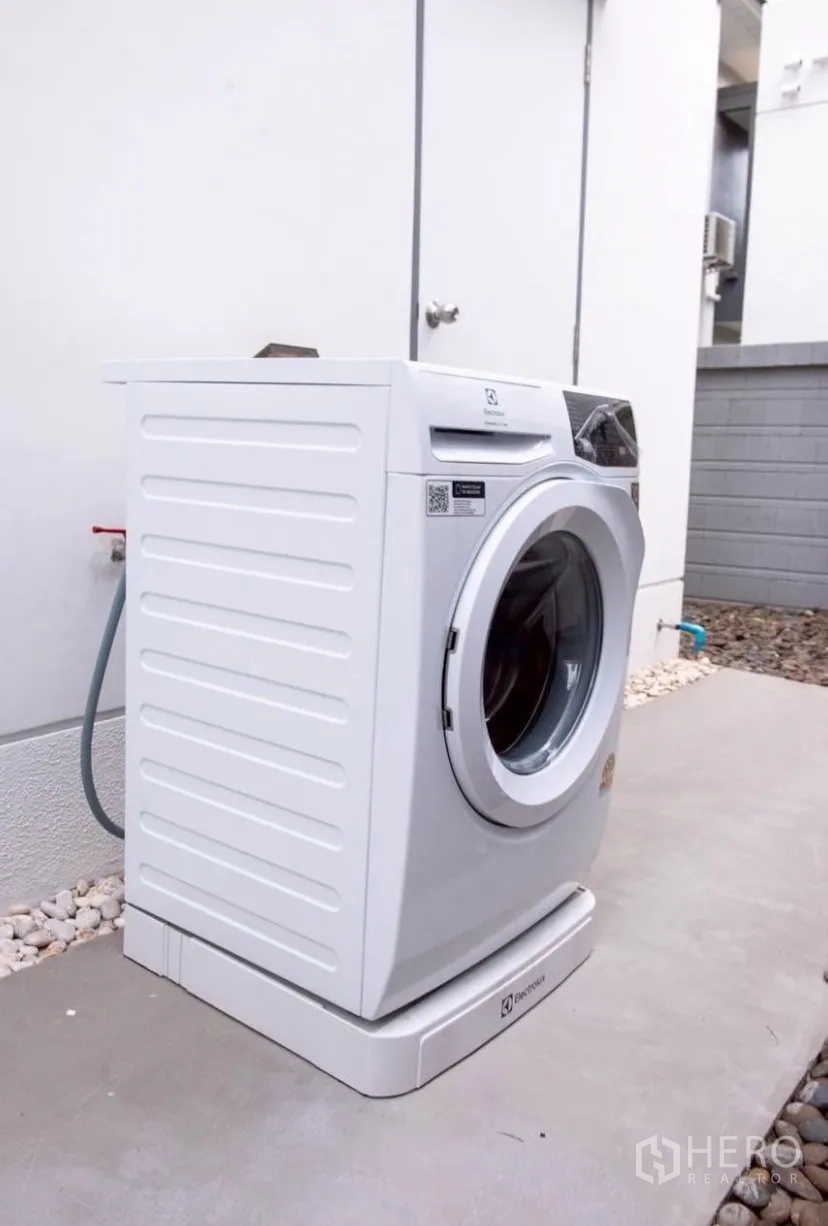 This modern two-storey detached house in Bang Phli offers 351 sqm of usable space on 76 sq wah of land (approx. 304 sqm or 0.19 rai). The layout features 4 bedrooms and 5 bathrooms, a bright living room plus an upstairs family lounge, and a stylish dining area with designer pendant lighting. A sleek Western kitchen with gas hob and hood is complemented by a separate Thai kitchen. The master suite includes built-in wardrobes and a bathroom with freestanding tub and double vanity. Landscaped front and side gardens, covered parking and multiple air conditioners add everyday comfort.