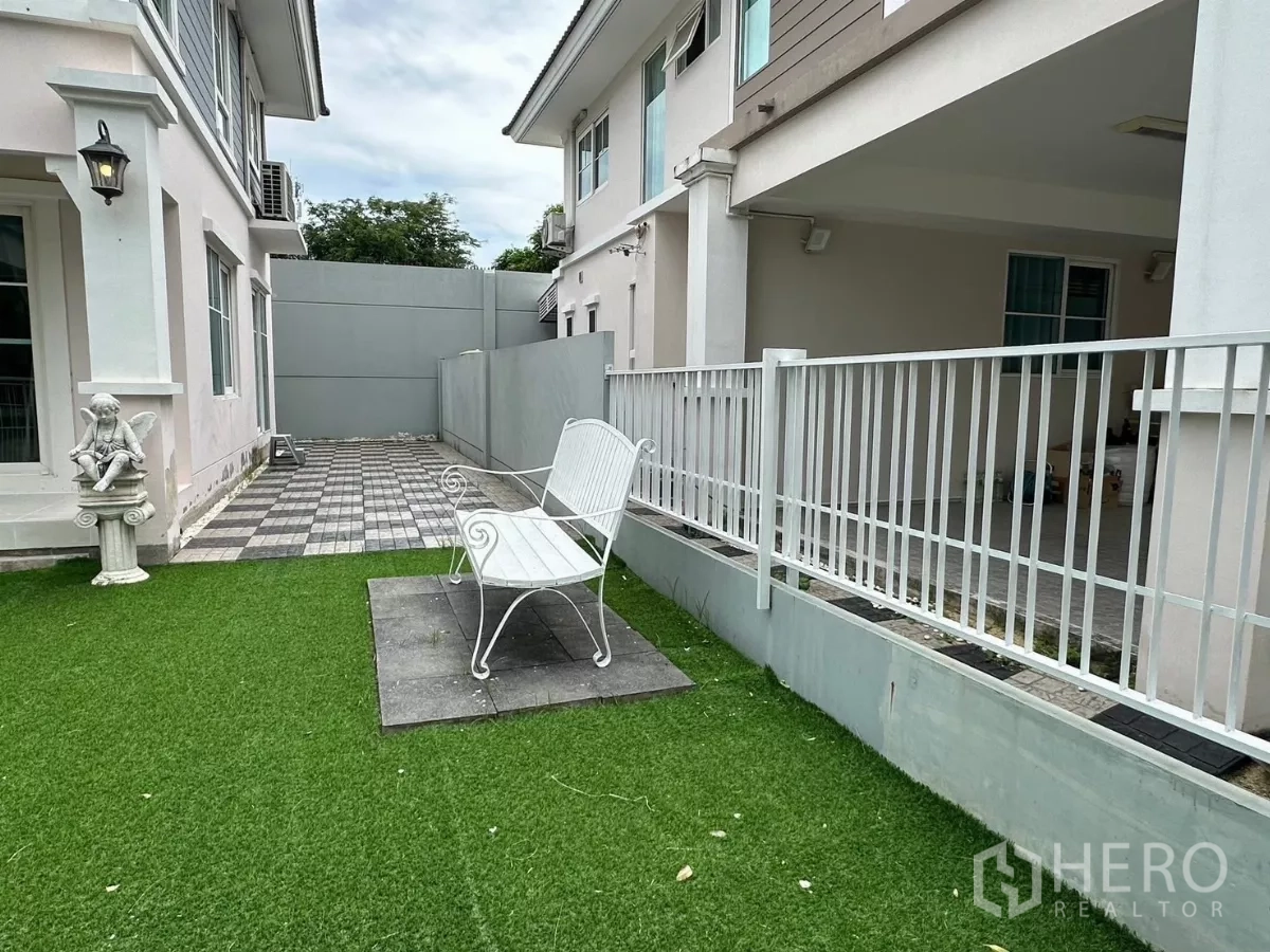 Move-in ready detached house at Chaiyaphruek Bangna KM.7 in Bang Kaeo, Bang Phli. The home offers 136 sq.m of usable space on 51 sq.wah of land (approx. 204 sq.m or 0.13 rai). It features 3 bedrooms and 3 en-suite bathrooms, a bright living and dining area with a marble feature wall, and a separate kitchen with gas hob, hood, microwave, fridge and washer/dryer. Enjoy a covered 2-car carport and a low-maintenance garden with artificial turf. Fully furnished with built-in and loose furniture, wallpaper, curtains and air-conditioning. Rent 55,000 THB/month.