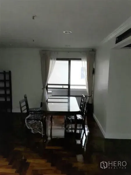 Discover an expansive 265 sqm, 3-bedroom, 3-bathroom condominium in the heart of Watthana. The open-plan living area features recessed lighting and custom back‑lit shelving, a large sofa zone with round coffee tables, and a TV console. A modern kitchen with extractor hood sits just beyond, ideal for family cooking and entertaining. Bedrooms come with polished wood floors, generous built‑in storage and mirrored wardrobes; the primary suite enjoys a wide bay window and a bright study nook. Sliding glass doors open to a usable balcony with city outlooks.