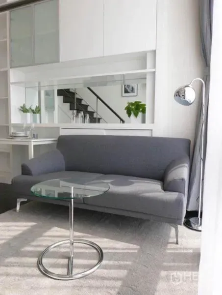 คอนโดขนาด 90 ตร.ม. 1 ห้องนอน 2 ห้องน้ำ สไตล์ลอฟต์ใจกลางเขตคลองเตย เด่นด้วยห้องนั่งเล่นเพดานสูงสองชั้น ผ้าม่านสูงจรดเพดาน โคมไฟดีไซน์ และผนังกระจกเงาช่วยเพิ่มแสงสว่าง มีชั้นวางบิวท์อินเต็มผนัง ครัวแบบเปิดพร้อมไอส์แลนด์ยาว เครื่องใช้ไฟฟ้าครบ และพื้นที่รับประทานอาหาร ชั้นลอยเป็นห้องนอนมีผนังกระจก ตู้เสื้อผ้าบิวท์อินขนาดใหญ่ และห้องน้ำหลักที่แยกอ่างอาบน้ำกับส่วนอาบน้ำกระจก อีกทั้งยังมีห้องน้ำสำหรับแขกที่ชั้นล่างเพื่อความสะดวก