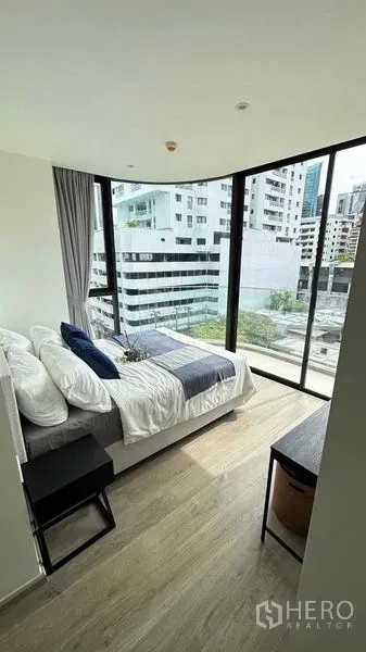 ห้องนอนบรรยากาศสงบ มีหัวเตียงบุผ้า โคมระย้า ตู้เสื้อผ้าบิวท์อิน และผ้าม่านโปร่ง-ทึบเพื่อการพักผ่อนที่เป็นส่วนตัว ทำเลใจกลางสุขุมวิท ใกล้ Terminal 21, Exchange Tower และสวนเบญจกิติ เดินทางสะดวกถึงมหาวิทยาลัยศรีนครินทรวิโรฒ (ประสานมิตร) และโรงพยาบาลบำรุงราษฎร์ ตอบโจทย์คนทำงานที่มองหาความสะดวกและการเชื่อมต่อเมืองที่ยอดเยี่ยม