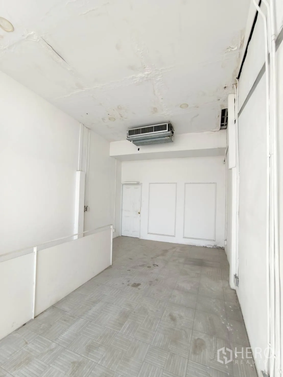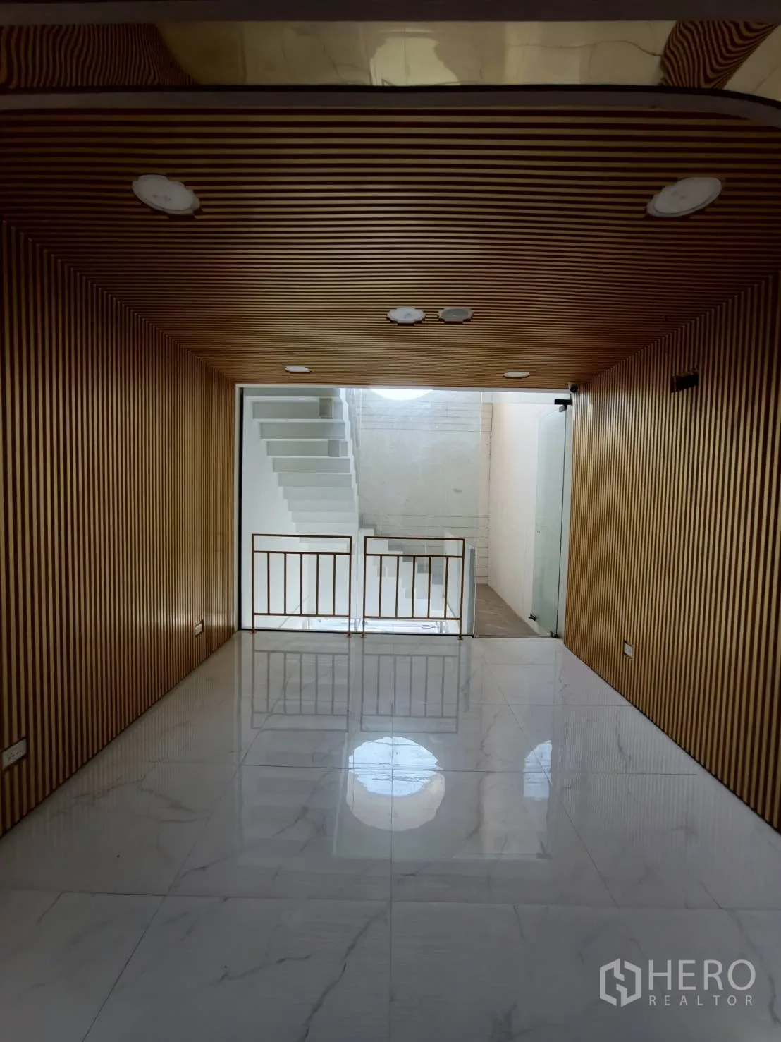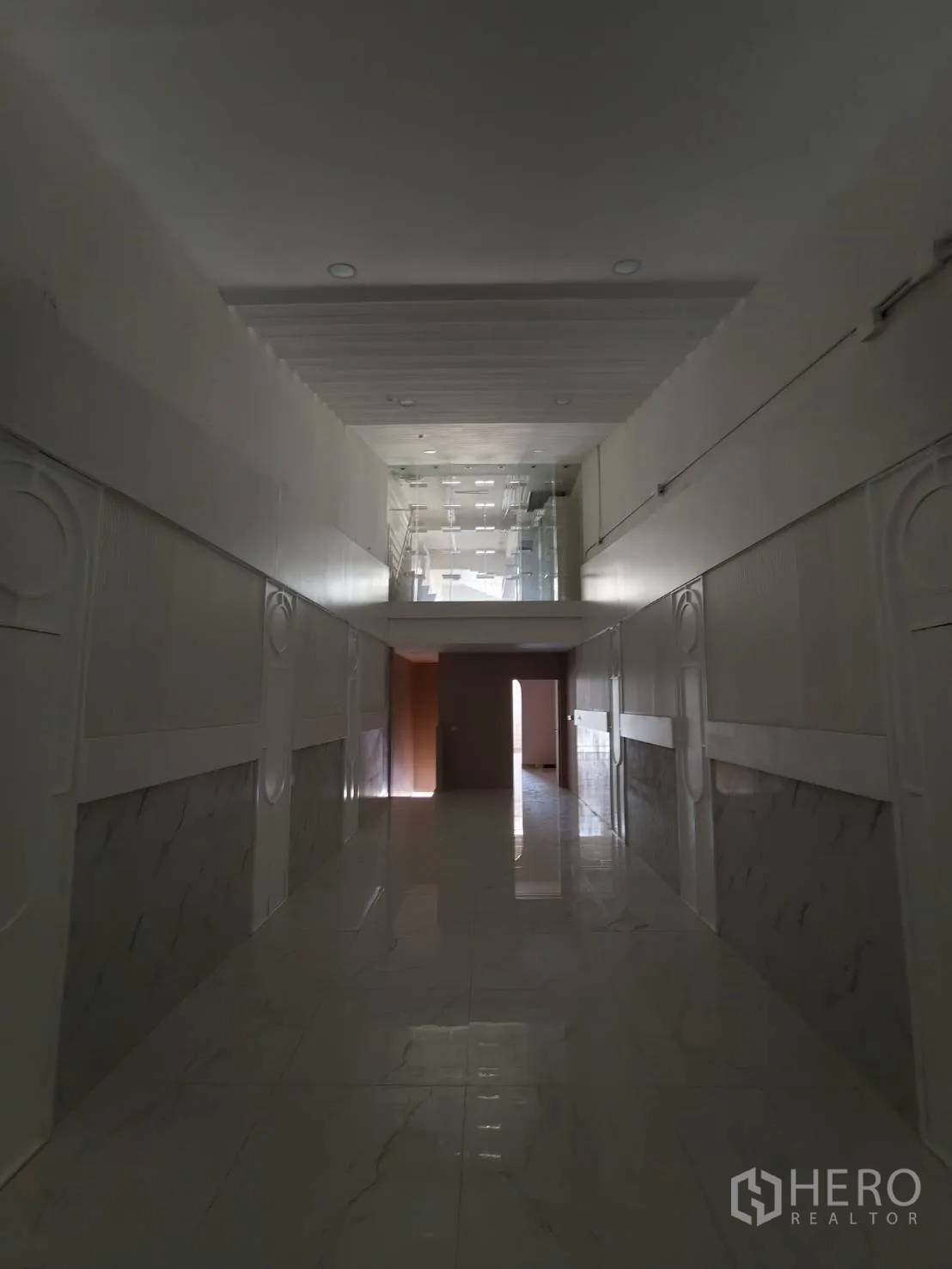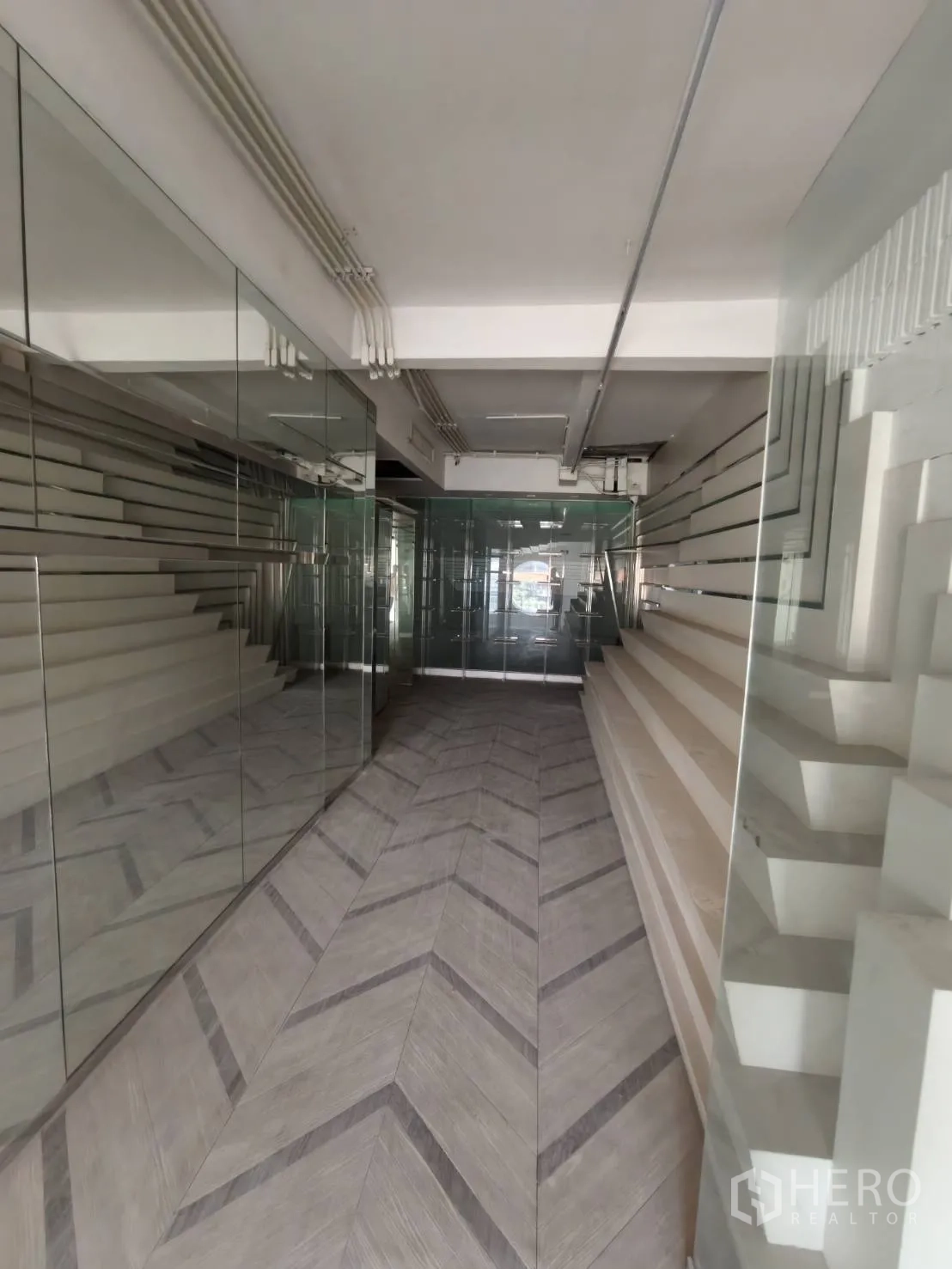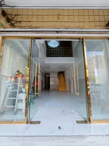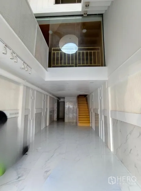 อาคารพาณิชย์ปรับโฉมใหม่ให้เช่าในเขตวัฒนา พื้นที่ใช้สอยประมาณ 280 ตร.ม. ขนาดที่ดิน 20 ตร.วา (ราว 80 ตร.ม. หรือประมาณ 0.05 ไร่) โดดเด่นด้วยหน้าร้านกระจกเต็มบาน เพดานสูง ไฟดาวน์ไลท์ และพื้นกระเบื้องลายหินอ่อน ภายในมีบันไดวนสีขาวขึ้นชั้นลอย ซุ้มโค้ง และบูธกั้นสำหรับแสดงสินค้าหรือห้องลอง เหมาะกับค้าปลีก โชว์รูม คลินิก คาเฟ่ หรือซาลอน