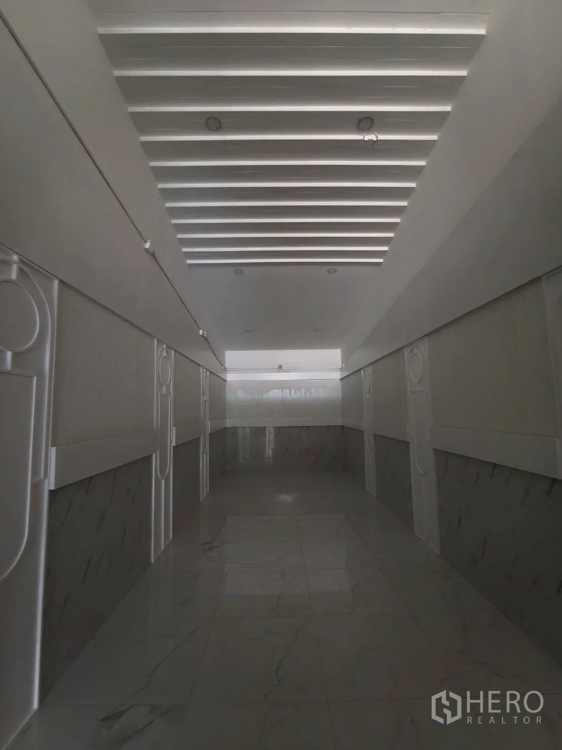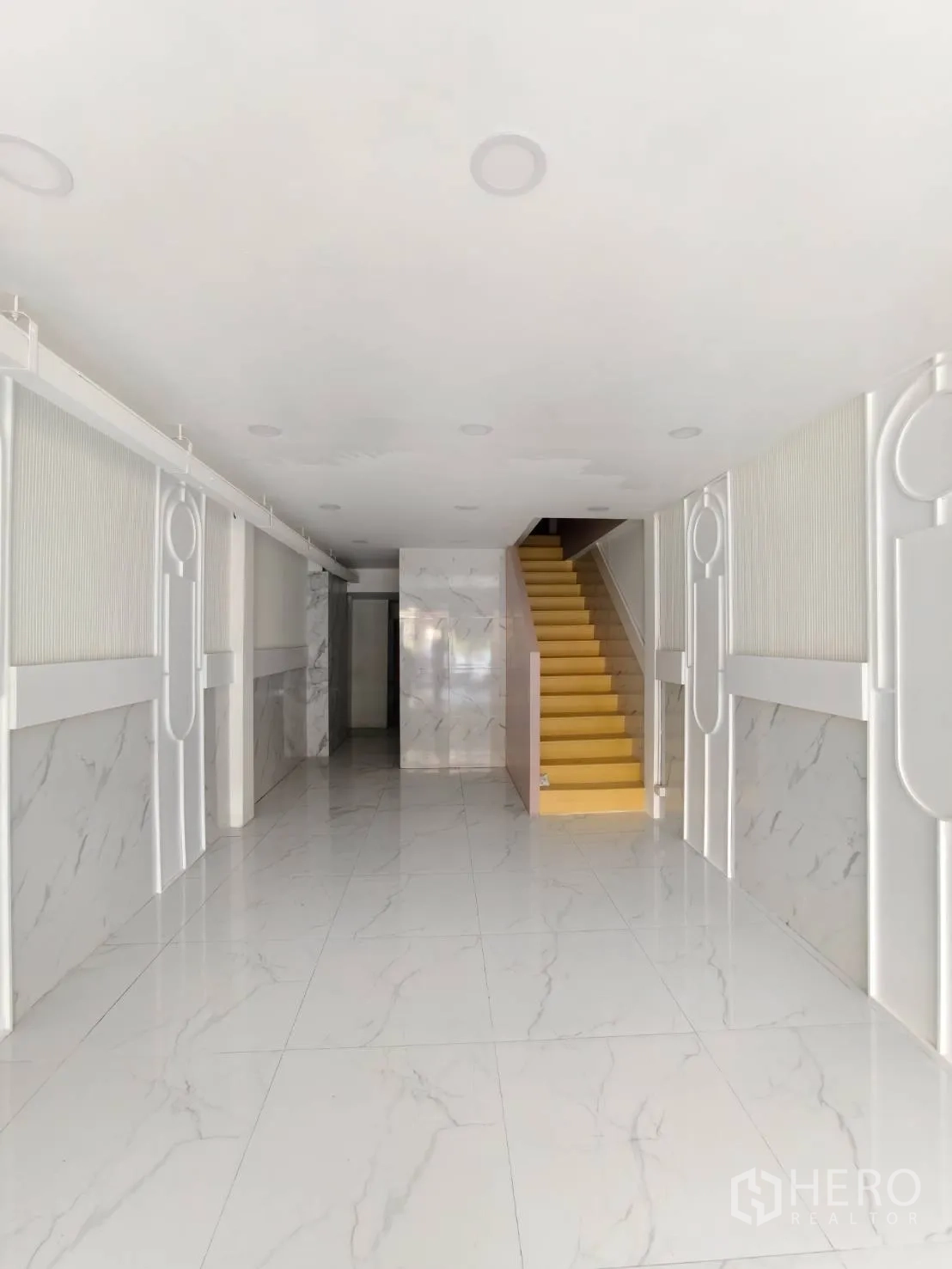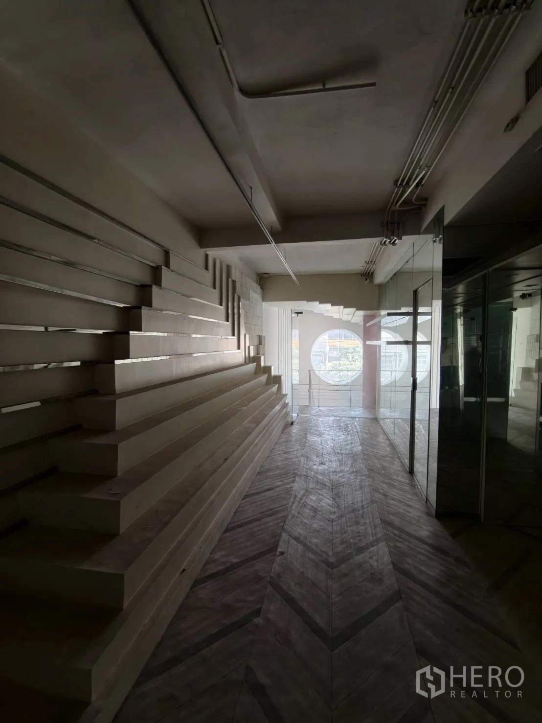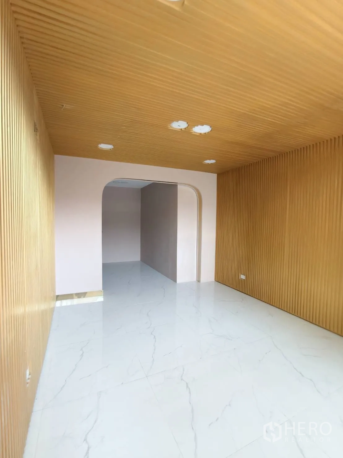 อาคารพาณิชย์ปรับโฉมใหม่ให้เช่าในเขตวัฒนา พื้นที่ใช้สอยประมาณ 280 ตร.ม. ขนาดที่ดิน 20 ตร.วา (ราว 80 ตร.ม. หรือประมาณ 0.05 ไร่) โดดเด่นด้วยหน้าร้านกระจกเต็มบาน เพดานสูง ไฟดาวน์ไลท์ และพื้นกระเบื้องลายหินอ่อน ภายในมีบันไดวนสีขาวขึ้นชั้นลอย ซุ้มโค้ง และบูธกั้นสำหรับแสดงสินค้าหรือห้องลอง เหมาะกับค้าปลีก โชว์รูม คลินิก คาเฟ่ หรือซาลอน