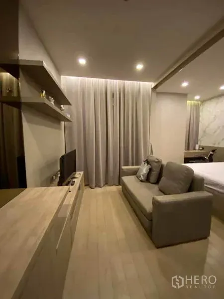 คอนโด 1 ห้องนอน 1 ห้องน้ำ ขนาดใช้สอย 36 ตร.ม. ในย่านวัฒนา ตกแต่งสไตล์โมเดิร์น พื้นที่เปิดโล่งเชื่อมครัวแพนทรี่กับโต๊ะทานข้าวสำหรับสองคน ครัวบิลท์อินพร้อมไมโครเวฟ ตู้เย็น และเครื่องซักผ้า ห้องนั่งเล่นสบายๆ เปิดออกสู่ระเบียงรับลมและมุมมองสกายไลน์ มีผนังทีวีลายหินอ่อนพร้อมไฟซ่อน กระจกเงาเก็บของ และไฟแขวนโทนอบอุ่น ห้องนอนเงียบสงบพร้อมหัวเตียงบุและโคมไฟข้างเตียงสไตล์โรงแรม