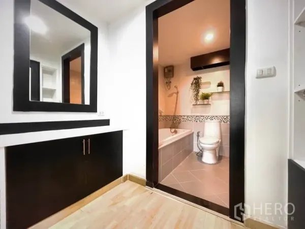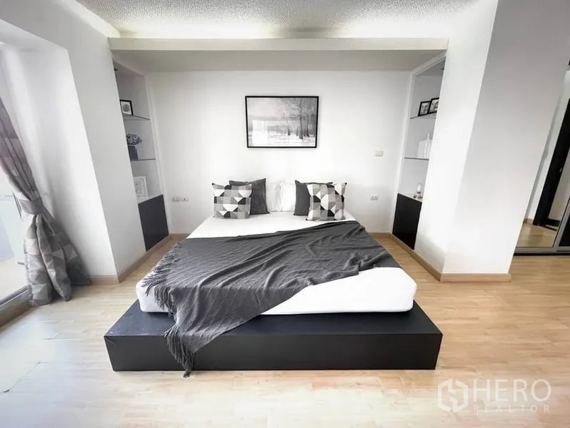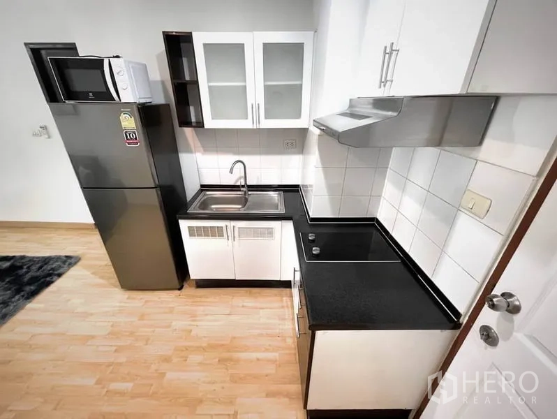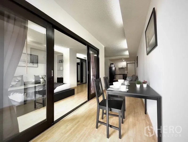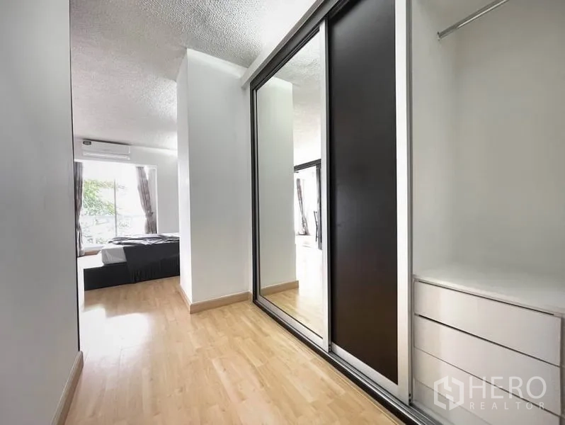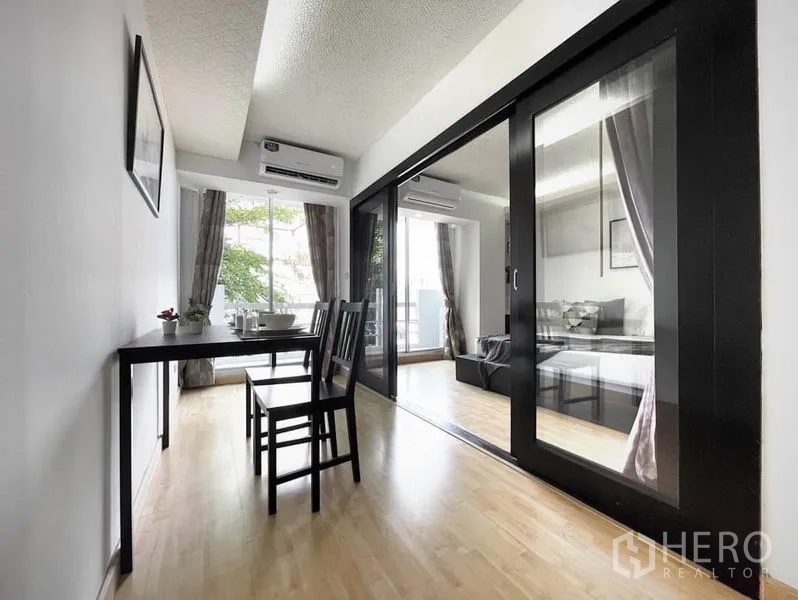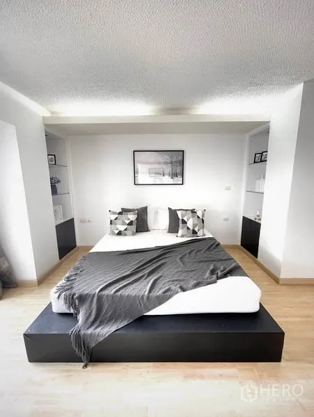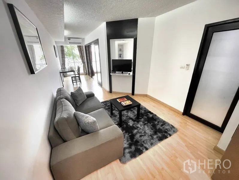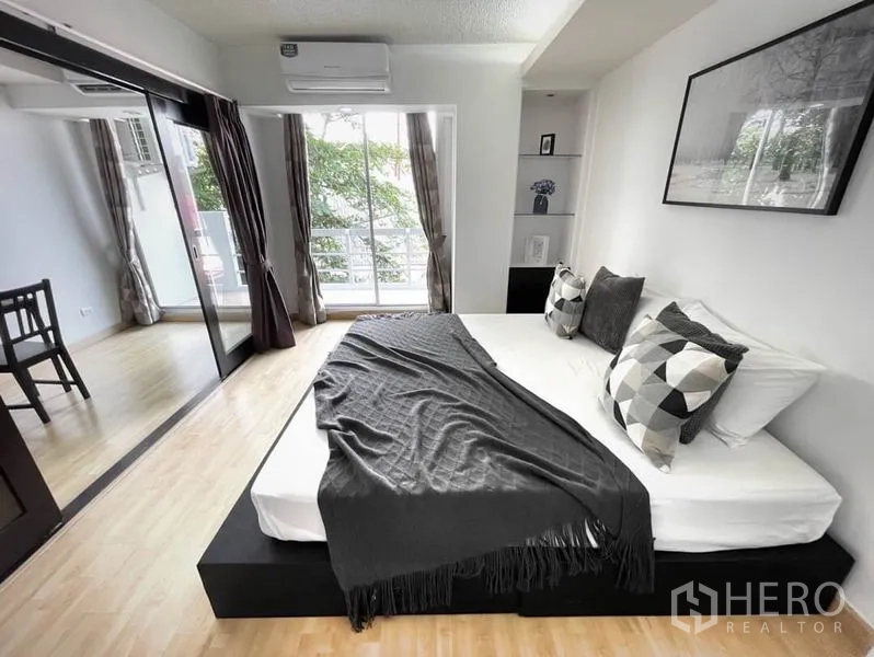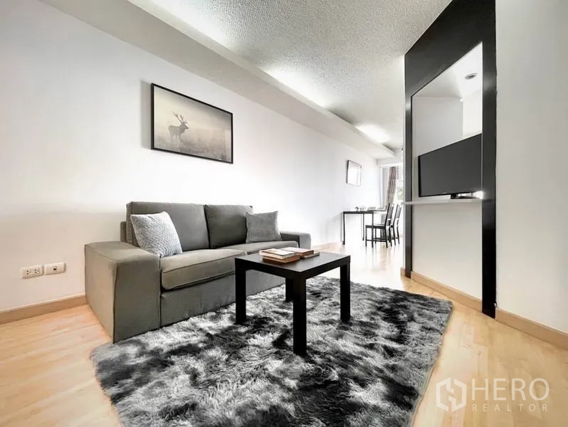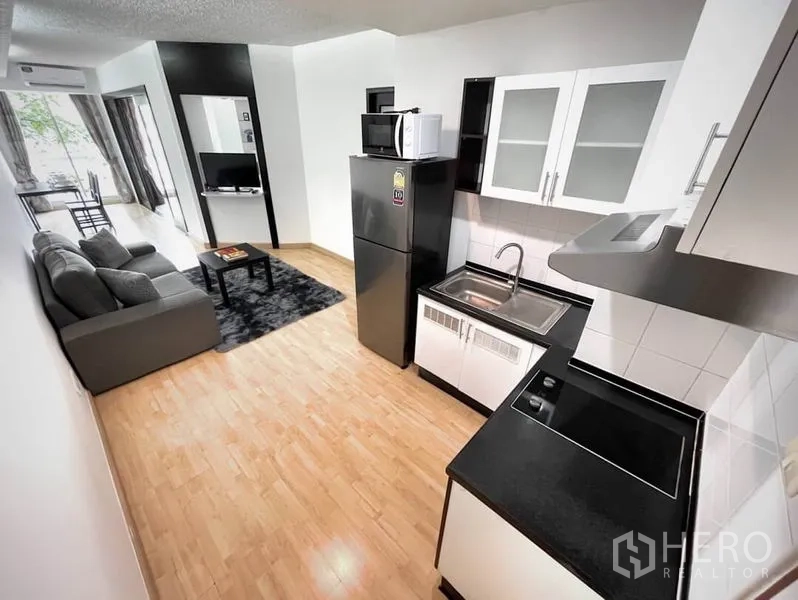 คอนโดให้เช่าขนาด 56 ตร.ม. 1 ห้องนอน 1 ห้องน้ำ ในเขตคลองเตย เดินทางสะดวกใกล้ BTS พร้อมพงษ์ พื้นที่นั่งเล่นโปร่งสว่างด้วยหน้าต่างเต็มบาน เชื่อมต่อสู่ระเบียงส่วนตัววิวเมือง ครัวแบบเปิดมาพร้อมตู้บิลท์อิน เตาปรุงอาหาร และมุมรับประทานอาหารขนาดกะทัดรัด ห้องนอนเงียบสงบพร้อมตู้เสื้อผ้าขนาดใหญ่ และห้องน้ำดีไซน์ทันสมัยพร้อมตู้กระจกอาบน้ำ