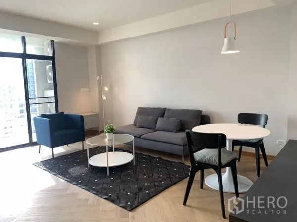 คอนโดมิเนียมขนาด 48 ตร.ม. 1 ห้องนอน 1 ห้องน้ำ ในย่านคลองเตย เดินทางสะดวกเพียงไม่กี่ก้าวถึง BTS เอกมัย ภายในเป็นโถงโอเพนแปลน ครัวสีขาวพร้อมไอแลนด์และมุมนั่งทานอาหาร รับแสงธรรมชาติเต็มที่จากกระจกสูงจรดเพดาน เชื่อมต่อสู่ระเบียงส่วนตัว ห้องนอนเงียบสงบมีม่านทึบและทีวีติดผนัง ห้องน้ำดีไซน์โมเดิร์นพร้อมตู้ shower กระจกและเคาน์เตอร์ยาว เปิดแอร์ครบ เข้าอยู่ได้ทันที