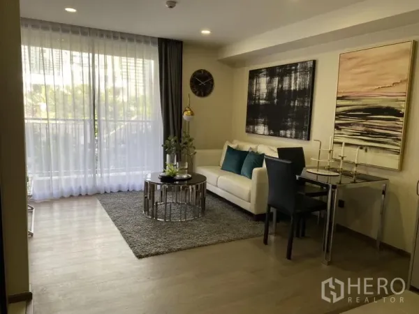 คอนโดมิเนียม 1 ห้องนอน 1 ห้องน้ำ ขนาด 54 ตร.ม. ใจกลางเขตปทุมวัน มาพร้อมพื้นที่นั่งเล่นแบบโอเพ่นโปร่งสบาย ครัวรูปแบบเส้นตรงดีไซน์โมเดิร์น ตู้บิลท์อินเงางาม เตาอินดักชันและเตาอบ เชื่อมต่อมุมรับประทานอาหารใต้โคมไฟสีทองสุดโดดเด่น ผนังกระจกเงาช่วยเพิ่มมิติ พื้นไม้โทนอุ่นและหน้าต่างเต็มบานเปิดสู่ระเบียง ห้องนอนเงียบสงบติดตู้เสื้อผ้าบานกระจกสโมก โต๊ะทำงานเต็มฟังก์ชัน และทีวีจอใหญ่ สร้างพื้นที่พักผ่อนอย่างมีสไตล์