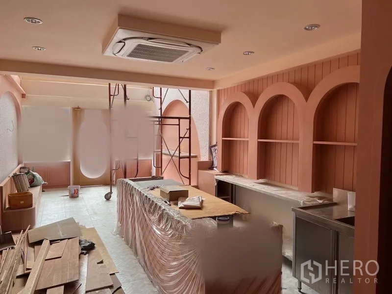 ต่อยอดธุรกิจของคุณกับอาคารพาณิชย์พื้นที่ใช้สอย 300 ตร.ม. ในเขตวัฒนา ใกล้บีทีเอสพระโขนง ภายในสว่างด้วยหน้าต่างโค้ง ผนังโทนพาสเทล พื้นลายก้างปลาและปาร์เกต์ พร้อมกระจกเต็มสูงเปิดสู่ระเบียงเล็ก มี 4 ห้องน้ำและพื้นที่โอเพ่นสเปซหลายชั้นยืดหยุ่นต่อการใช้งาน ชั้นวางโชว์บิวท์อินและเคาน์เตอร์บริการเหมาะสำหรับคาเฟ่ โชว์รูม สตูดิโอ หรือออฟฟิศ ครัวเตรียมอาหารสแตนเลสด้านหลังพร้อมฮู้ดรองรับงานเบาๆ