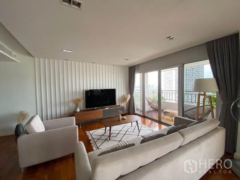คอนโดขนาด 236 ตร.ม. 3 ห้องนอน 3 ห้องน้ำ ในย่านสาทร พื้นที่นั่งเล่นแบบเปิดโล่งเชื่อมต่อโซนรับประทานอาหารและครัว พร้อมประตูบานเลื่อนกระจกเต็มบาน เปิดออกสู่ระเบียงลึกชมวิวสกายไลน์กรุงเทพฯ พื้นไม้จริงโทนอบอุ่นและเฟอร์นิเจอร์โทนเรียบให้บรรยากาศสบาย ครัวบิลต์อินพร้อมไอแลนด์ พื้นที่เก็บของมาก และตู้เย็นสองประตู ห้องน้ำสไตล์โมเดิร์นมีฉากกั้นอาบน้ำกระจกและเคาน์เตอร์อ่างล้างหน้าขนาดยาว ห้องนอนกว้าง รับแสงธรรมชาติและมีทางออกสู่ระเบียง เหมาะสำหรับครอบครัว