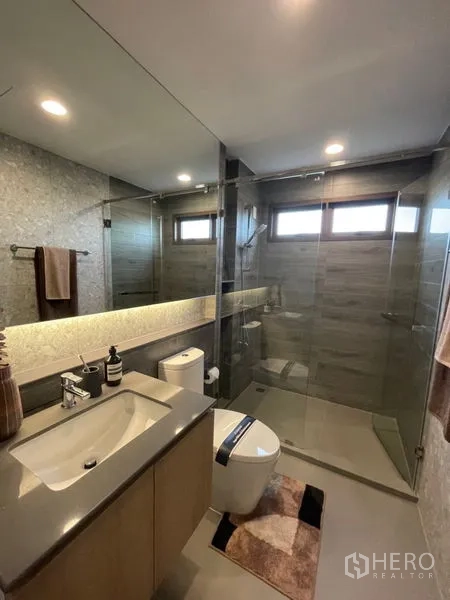 บ้านเดี่ยวสไตล์โมเดิร์นในย่านบางกะปิ พื้นที่ใช้สอย 300 ตร.ม. บนที่ดิน 77 ตร.วา (ประมาณ 308 ตร.ม. หรือราว 0.19 ไร่) จัดสรรฟังก์ชันลงตัว 4 ห้องนอน 5 ห้องน้ำ โถงเพดานสูง ห้องนั่งเล่น–รับประทานอาหารแบบโอเพ่นสเปซ ห้องทำงานส่วนตัว ห้องนอนมาสเตอร์พร้อมวอล์กอินคลอเซ็ตและระเบียงส่วนตัว ห้องน้ำดีไซน์โมเดิร์น สวนตกแต่ง และที่จอดรถในร่ม 2 คัน