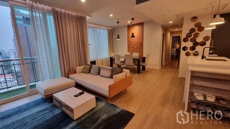 คอนโดขนาด 109 ตร.ม. 2 ห้องนอน 2 ห้องน้ำ ตกแต่งสไตล์ร่วมสมัยอบอุ่น ใจกลางเขตวัฒนา พื้นที่นั่งเล่นและรับประทานอาหารแบบเปิดโล่ง เชื่อมต่อระเบียงด้วยหน้าต่างสูงจรดเพดาน พื้นไม้และแสงไฟละมุนช่วยสร้างบรรยากาศผ่อนคลาย ครัวโมเดิร์นมีไอส์แลนด์กว้าง แผงผนังกระเบื้องซับเวย์ เตาอบบิลท์อิน และไฟห้อย เหมาะสำหรับทำอาหารและสังสรรค์ ห้องนอนหลักมีตู้เสื้อผ้าบานกระจกและผนังตกแต่ง ส่วนห้องน้ำหนึ่งมีตู้ชาวเวอร์กระจก อีกห้องมีอ่างอาบน้ำให้แช่สบาย