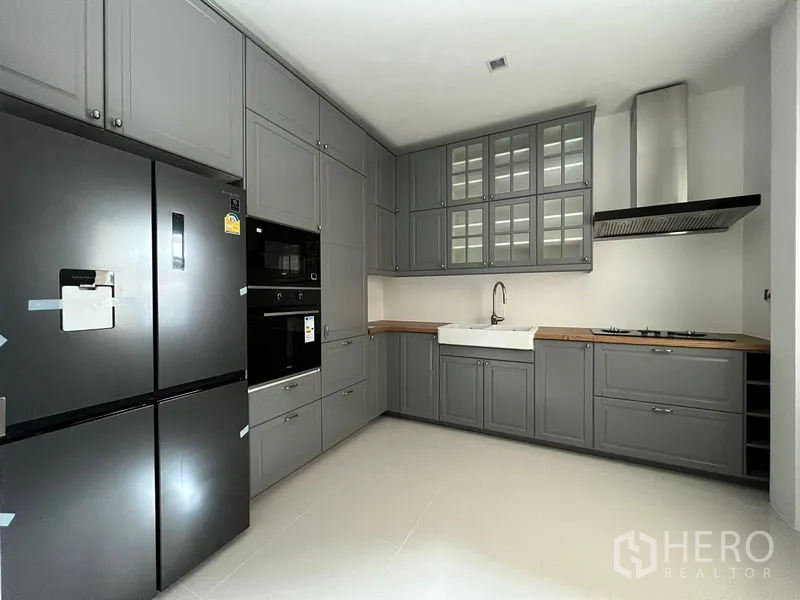 บ้านเดี่ยวสไตล์โมเดิร์น ทำเลแขวงคลองกุ่ม เขตบึงกุ่ม กรุงเทพฯ พื้นที่ใช้สอย 433 ตร.ม. บนที่ดิน 94 ตร.วา (ประมาณ 376 ตร.ม. หรือราว 0.24 ไร่) 4 ห้องนอน 5 ห้องน้ำ โซนรับแขกและทานข้าวโปร่งโล่ง ผนังกระจกเต็มบานรับแสงธรรมชาติ พื้นลายหินอ่อนสวยงาม ห้องนอนชั้นบนพื้นไม้จริง มาสเตอร์บาธมีอ่างอาบน้ำขนาดใหญ่และห้องอาบน้ำกระจก ห้องน้ำอื่นๆ แยกส่วนเปียกแห้ง ครัวบิวท์อินสีเทาพร้อมเตา ฮูด เตาอบ และตู้เย็นขนาดใหญ่ มีพื้นที่ซักล้าง/ยูทิลิตี และจอดรถในรั้วบ้าน