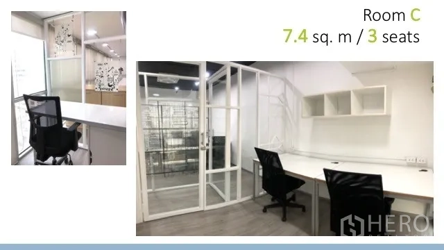 ออฟฟิศพร้อมเข้าใช้งานขนาด 80 ตร.ม. ที่อาคาร Sukhumvit Suites ออกแบบลงตัวสำหรับทีมที่ต้องการทั้งความเป็นส่วนตัวและพื้นที่ร่วมงาน ประกอบด้วยห้องประชุมกระจก 6 ที่นั่ง ห้องส่วนตัว 3 ห้อง (Room A 10.7 ตร.ม. 4–5 ที่นั่ง, Room B 12 ตร.ม. 4 ที่นั่ง, Room C 7.4 ตร.ม. 3 ที่นั่ง) และโซนโอเพ่นแปลนพร้อมโต๊ะยาว 8 ที่นั่ง รับแสงธรรมชาติจากหน้าต่างบานใหญ่ ฉากกระจกฝ้าและไฟสว่างให้บรรยากาศมืออาชีพ มีแพนทรีและมุมเครื่องถ่ายเอกสารครบครัน